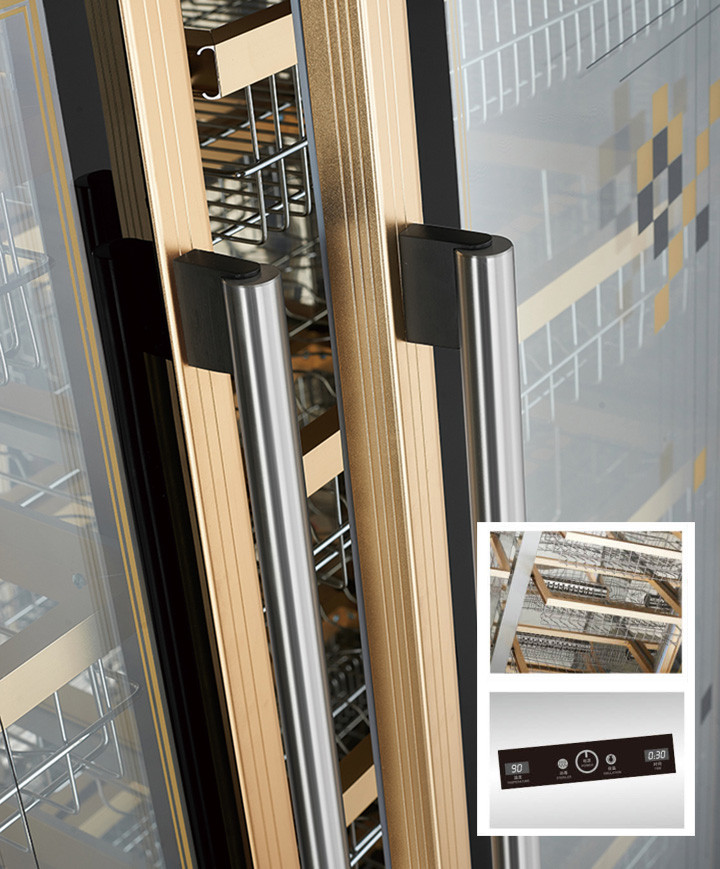 電腦控制觸摸屏,光波高溫消毒;可透視玻璃門,整體發泡保溫;豪華不銹鋼把手,鋁合金推拉式導軌;特設超高溫保護功能。